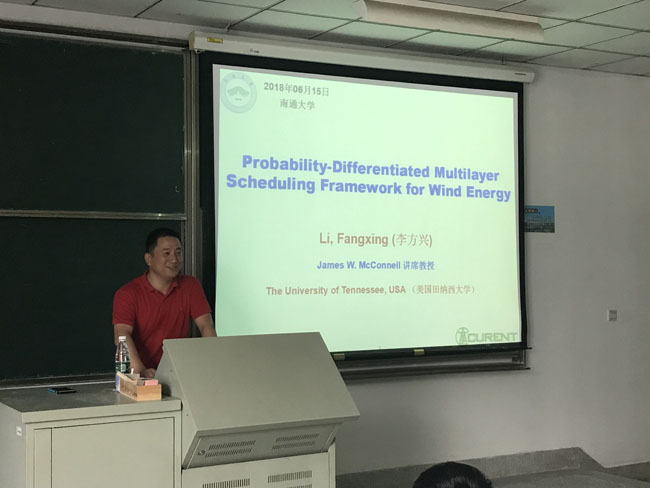 2018年6月15日,公司邀请田纳西大学CURENT研究中心终身教授李方兴博士为公司电气工程及其自动化专业15级员工、研究生还有部分老师作了一场学术报告,报告题目为“Probability-differentiated scheduling framework for wind power”。