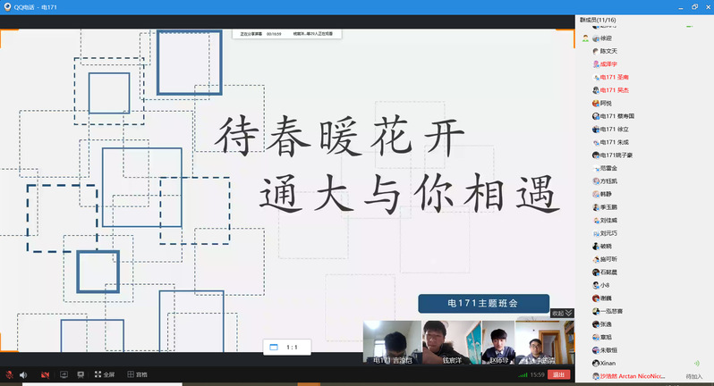 2月28日上午,顾菊平副董事长以班主任身份,通过QQ视频,组织召开以“待春暖花开,通大与你相遇”为主题的班会,电171班全体同学参加会议。