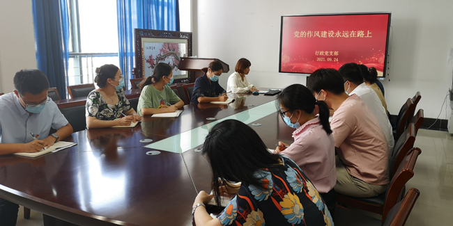 2021924日,行政党支部书记刘峰为支部党员上了一堂题为《党的作风建设永远在路上》的党课,重点学习了中国共产党百年作风建设宝贵经验和新时代党的作风建设的重要贡献。
