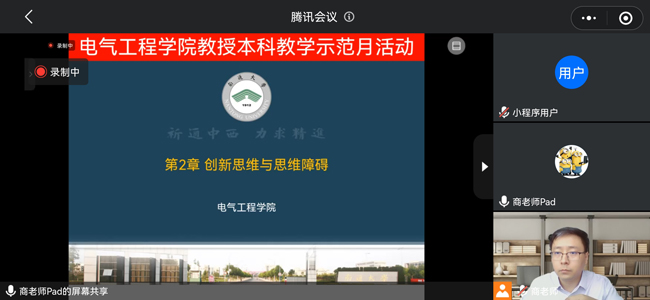 商亮亮教授以《创造学与创新实践》这门课程为例,利用腾讯会议线上授课方式,认真准备、精心设计课堂教学,在课堂上用自己独到的教学方式,丰富的知识内涵,娴熟的驾驭课堂能力,灵活多变的公司产品方法和先进的现代化教学手段,为青年教师们展示了一节精彩的教授示范课。
