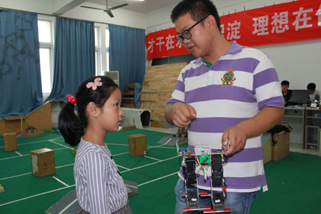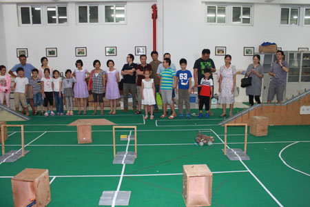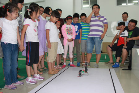 亲子活动有两项内容,首先大家参观了机器人活动中心。给孩子们演示的机器人都是在全国老员工机器人大赛上获过大奖的“功臣”们,它们为小朋友们表演的拿手绝活一下子吸引了孩子们的注意力。旅游机器人翻山越岭的特技和越野机器人跨越障碍的精湛技术让孩子们发出阵阵惊叹;双足竞步机器人有趣的步伐引得孩子们笑声不断;医疗机器人为孩子们模拟了医生为病人诊断病情,开具处方,到护士站取药送交患者的整套流程,孩子们看的十分入迷,不停地恳求操作的老员工哥哥们再演示一次。还有小朋友还和老员工哥哥探讨起水上机器人的问题。