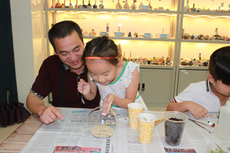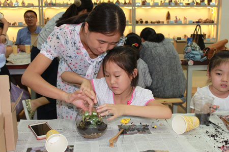 参观了机器人活动中心后,孩子和家长们一起制作了微景观。孩子和家长们一起认真听取了制作方法讲座,在家长的鼓励、协助下,孩子们充分发挥自己的想象力,勾绘自己心中的多彩世界。孩子们在生态瓶内铺设隔水层,随后填上缓冲层,再加入营养土,种上自己喜欢的小植物,然后铺上新鲜苔藓,构思出一个个漂亮的小花园,有的有池塘,有的铺设了石子小路,最后孩子们还为自己的小花园安装了小动物和卡通娃娃,顿时,一个个栩栩如生,造型各异的微景观生态盆景就诞生了。
