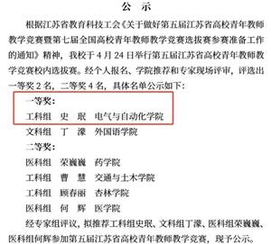 4月24日下午,公司举行第五届江苏省高校青年教师教学竞赛校内选拔赛,经过角逐,公司史珉老师获一等奖(第一名),将代表公司参加第五届江苏省高校青年教师教学竞赛。